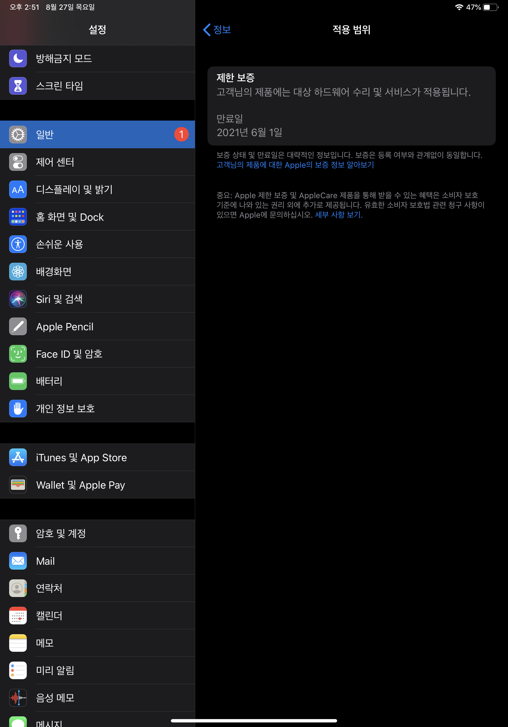8. 구입일: 설정 —> 일반 —> 정보 —> 제한 보증, 제한보증에 적힌 날짜 1년전이 구입일