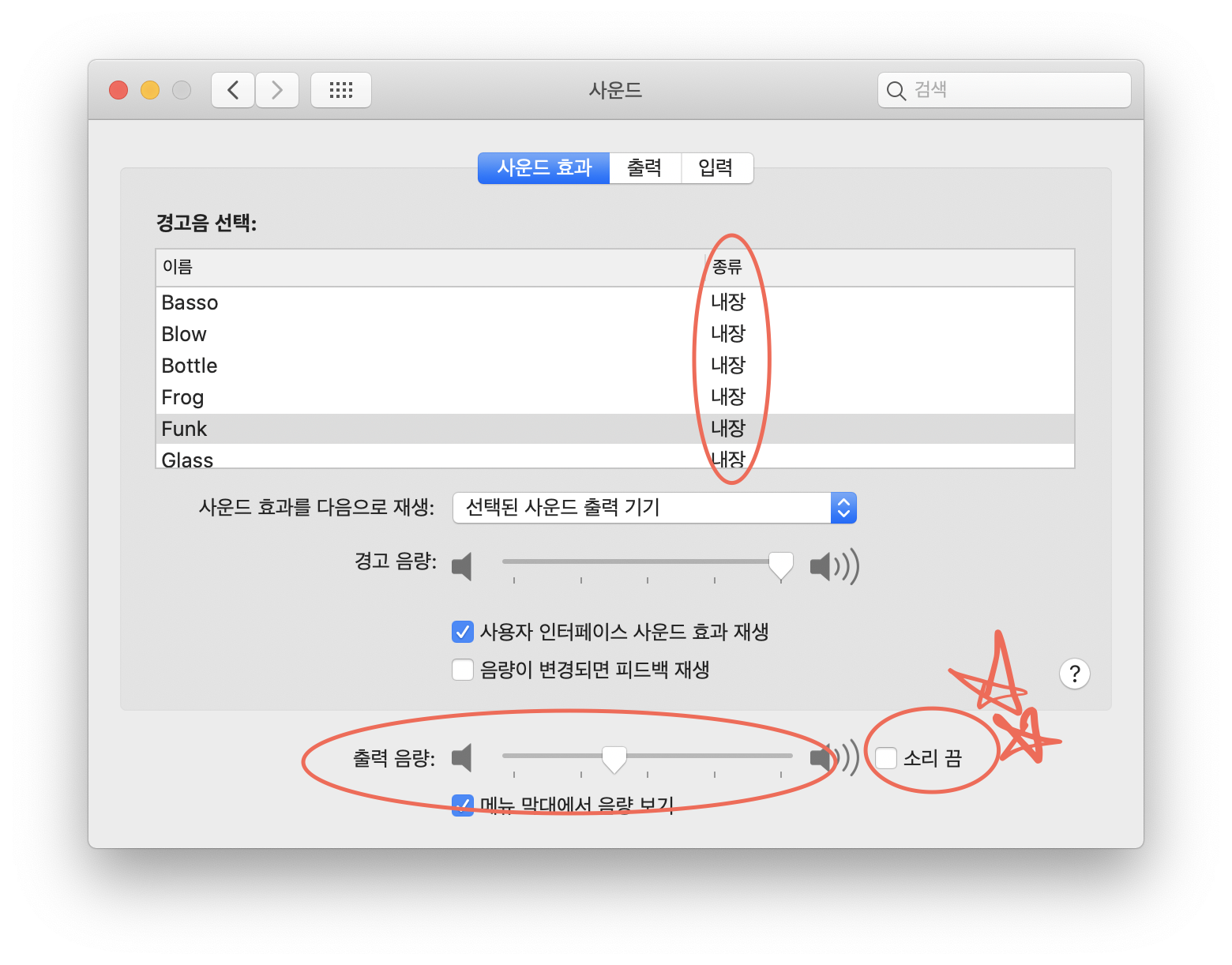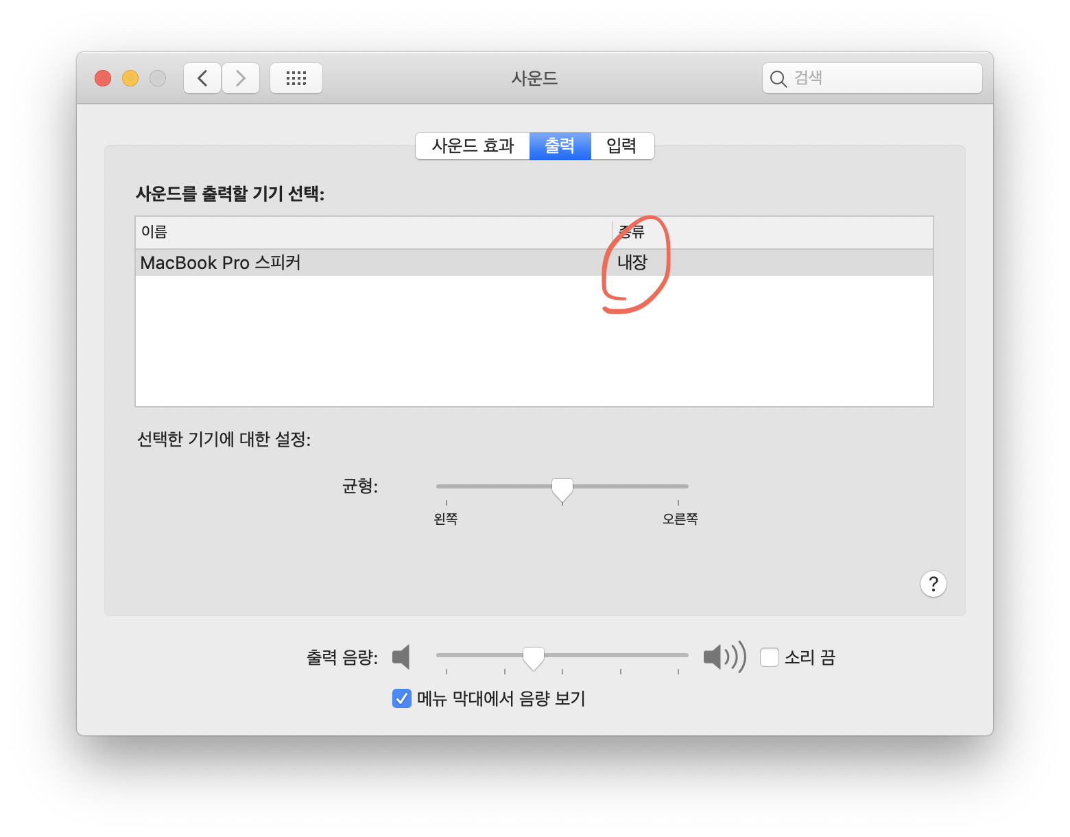 5. 앞에서 해결되지 않았다면 '출력' 탭으로 간다. 사운드를 출력할 기기가 내장으로 되어있는지 확인한다. 만약 내장으로 되어있고 음소거 설정도 안했는데 소리가 안난다? 살짝 암울해지기 시작하는 순간이다.