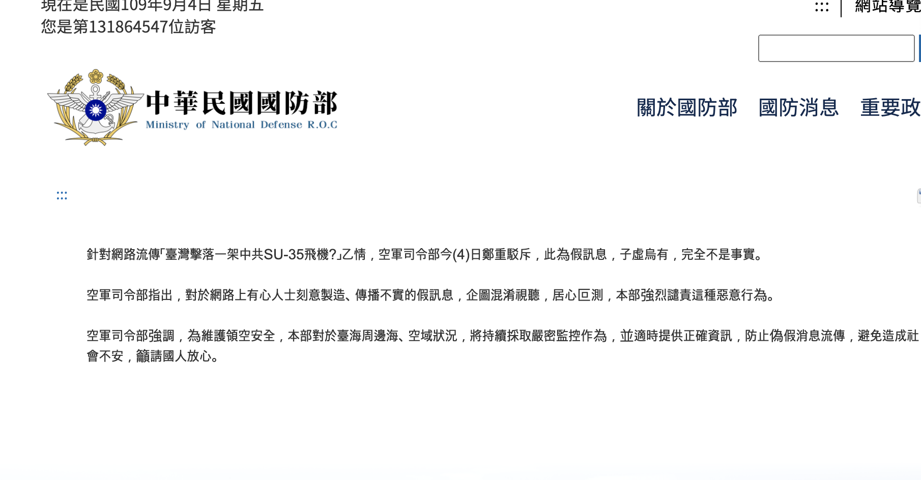 대만 공군 사령부가 “대만이 중국의 Su-35 항공기를 격추시켰다”라는 인터넷 발 루머에 대응해 공식적으로 사실이 아님을 국방부 홈페이지를 통해 4일 확인했다.