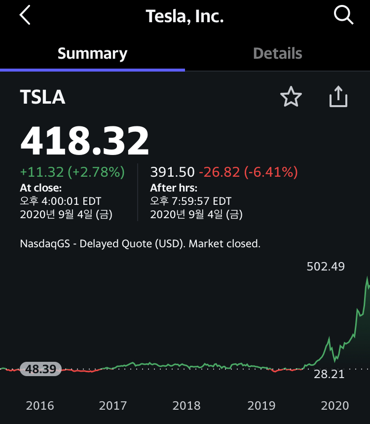▷ 지난 8월 액면분할이 이루어진 후 현재 테슬라의 주당 가격은 418.32 달러(20년 9월 7일 기준)다. 이는 특히 2020년 들어 비정상적으로 보일 정도로 급등한 수치다.