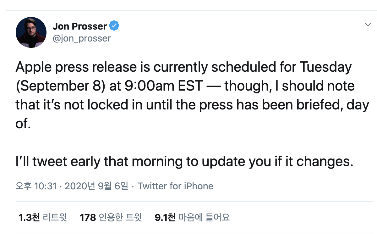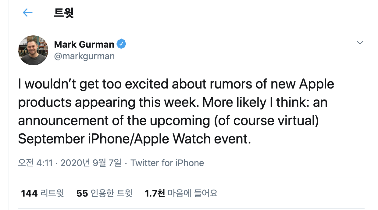 ✑ 한편 트위터의 또다른 애플 전문가 마크 거먼은 프로서가 언급한 화요일 출시는 아이폰12에 대한 것일 확률이 높다고 주장하기도 했다.
