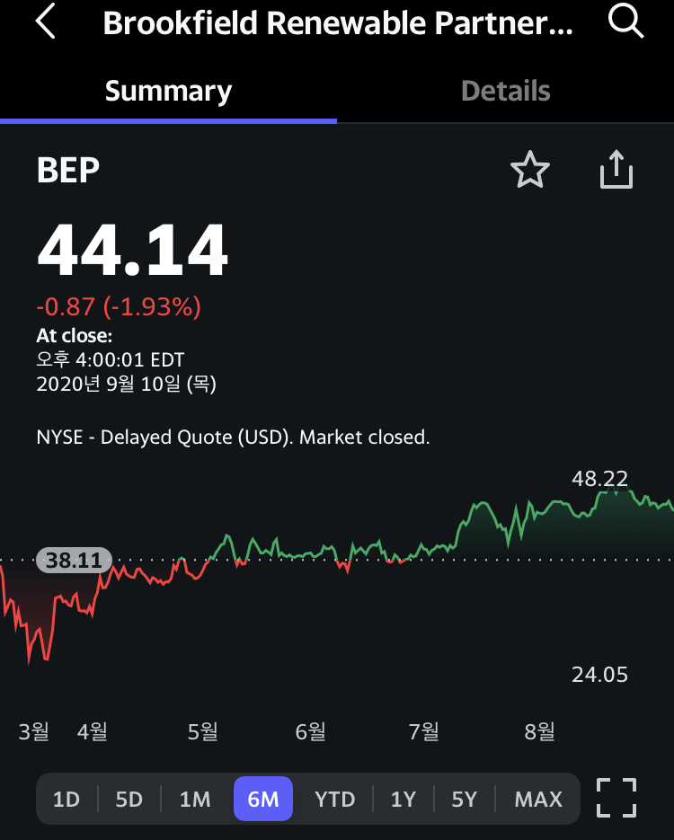 여의도 IFC몰을 보유하고 있는 거대 투자 기업 ‘브룩필드 자산운용’에서 60% 이상의 지분을 소유하고 있는 브룩필드 리뉴어블 파트너스는 재생가능 에너지 기업이다. 고배당주로도 알려져 있는 기업이다.