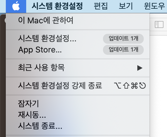 일단 화면 최상단 좌측에 위치한 애플 기호를 클릭해 하단 메뉴를 열고, 시스템 환경설정으로 들어갑니다.