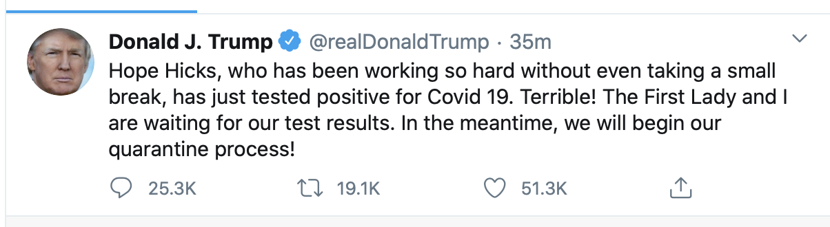 도널드 트럼프 미국 대통령이 10월 1일(현지시간) 코로나 바이러스 검사를 받았다고 트위터를 통해 밝혔다.