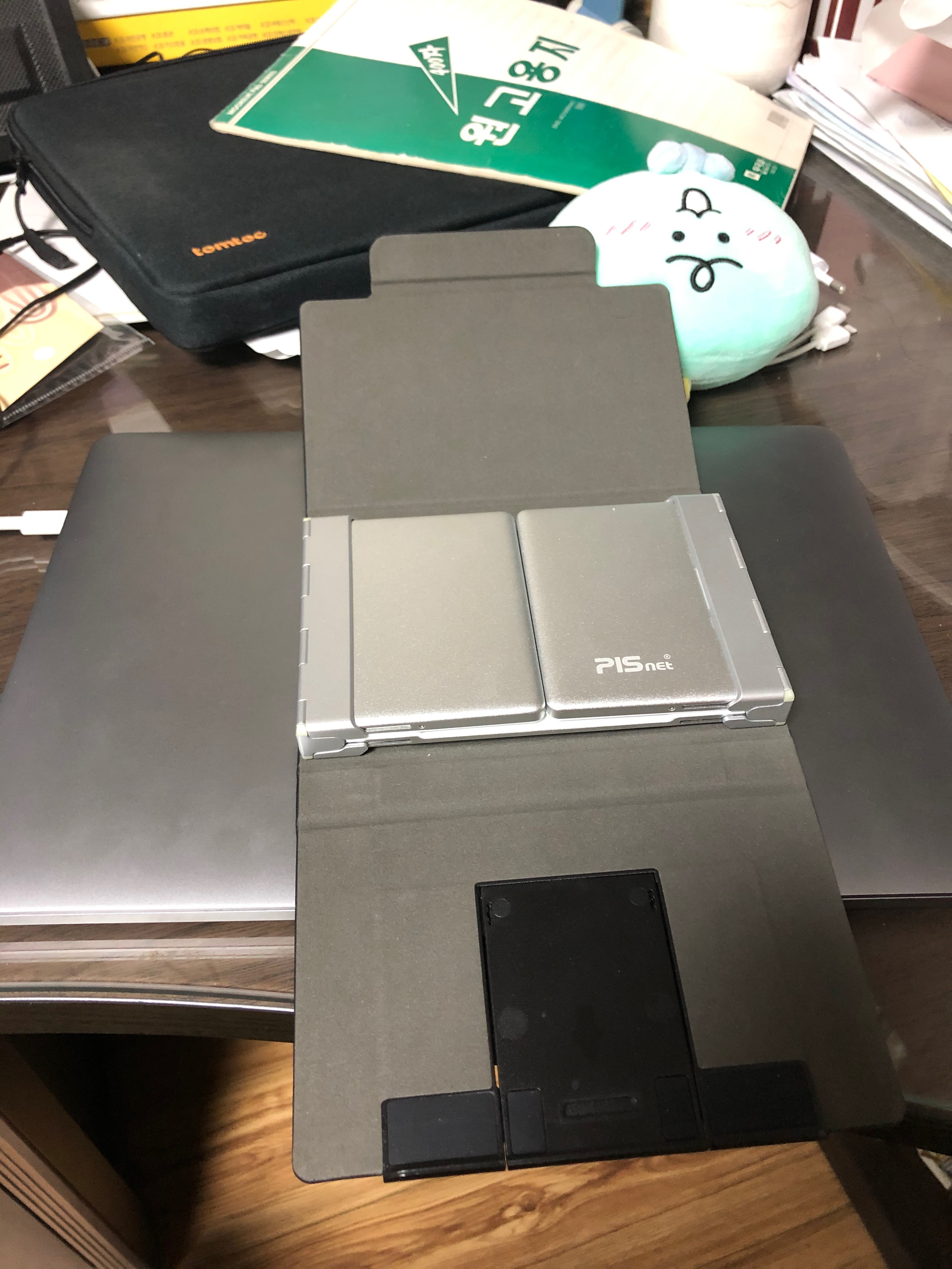 그리고 그 결과 찾아낸 제품이 바로 삼지아이티의 피스넷 폴더라는 제품입니다. 구매 당시 가격은 3만원 초반, 케이스까지 구매하니 만원 정도 추가되었던 것 같습니다. 무게도 부담스럽지 않습니다. 정확한 무게는 모르겠으나 케이스까지 장착한 상태에서 대략 아이폰8 두 개쯤 되는 듯 합니다. 접이식이니 휴대가 간편하기도 하죠. 그리고 케이스를 이용하면 세로 거치도 무리없이 가능합니다. 제 조건 세 가지를 부합하는 제품입니다.