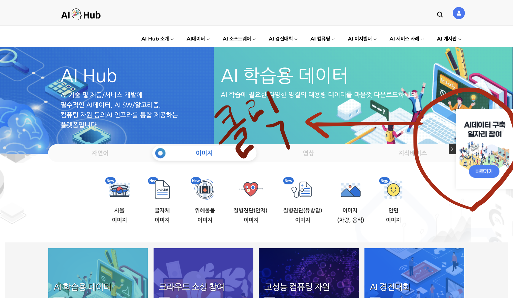 AI허브(aihub.or.kr)에 접속해 ‘크라우드소싱 기반 인공지능 데이터 가공 일자리정보’ 페이지를 클릭합니다.