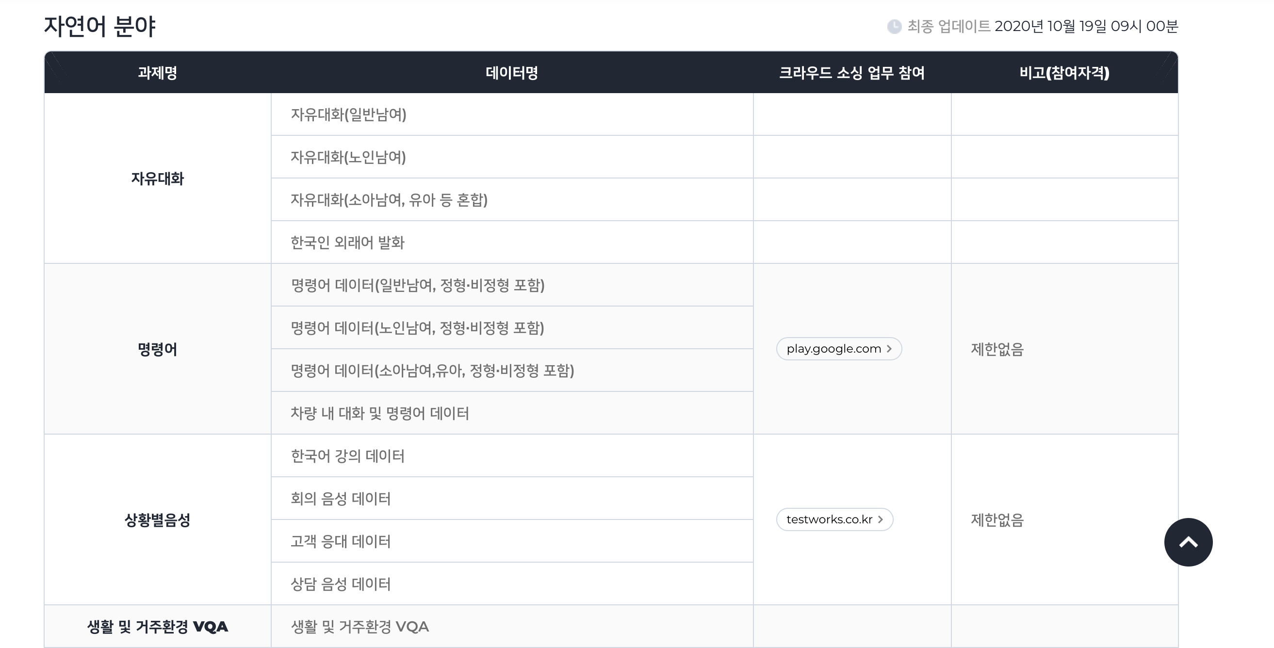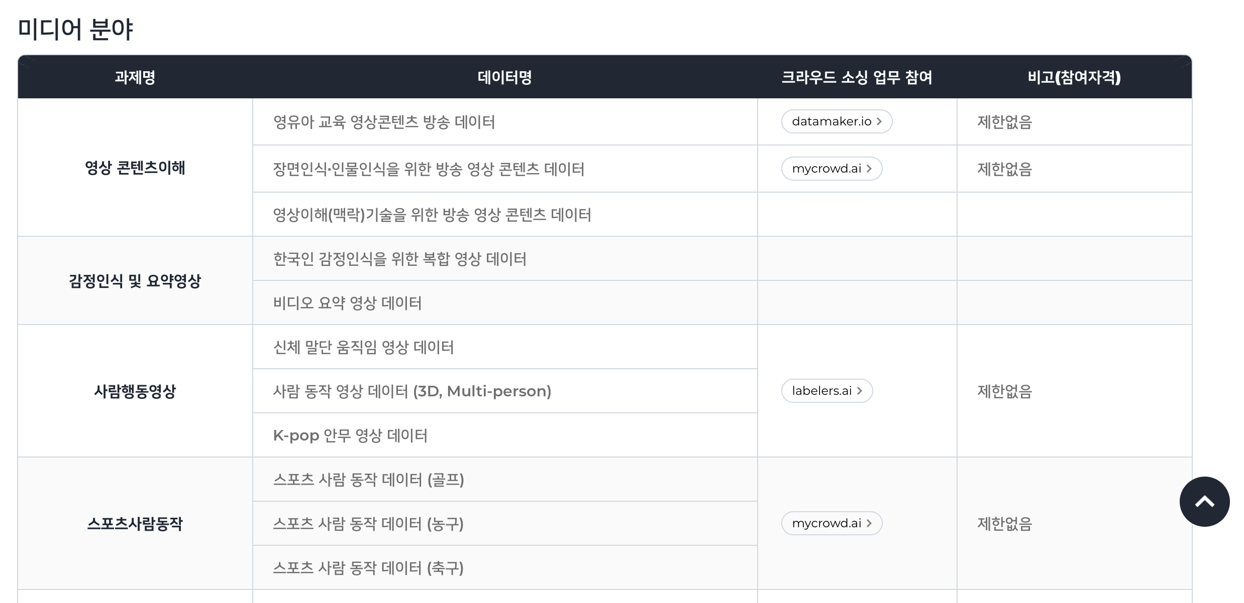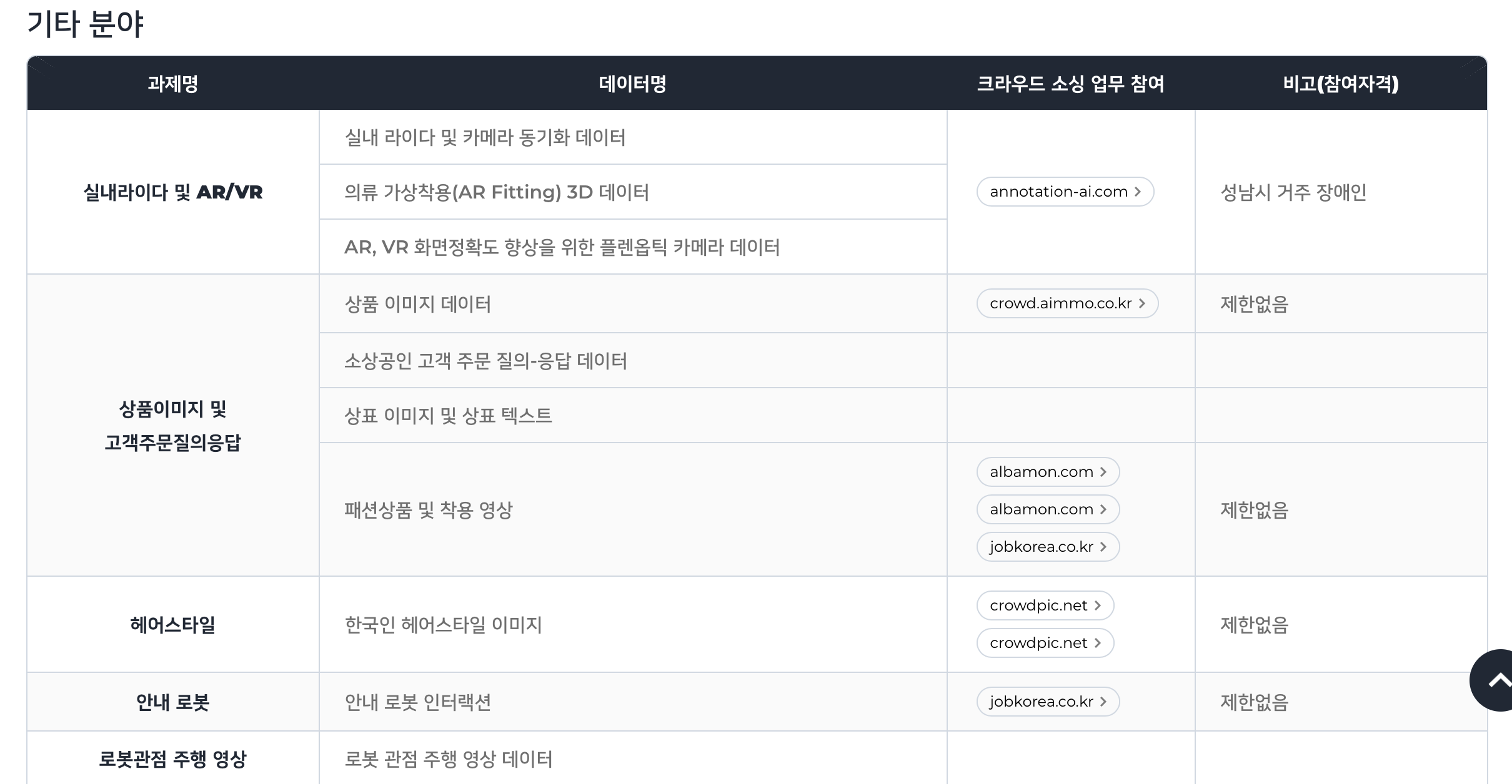 스크롤을 내리면 다양한 분야에서 크라우드 소싱 업무를 확인할 수 있습니다. 이 중 현재 데이터 수집을 진행 중인 업무에 크라우드 워커로서 참여할 수 있습니다. 과제명을 확인하고 마음에 드는 작업을 진행하면 됩니다. 참여가능한 작업은 매일 업데이트됩니다.