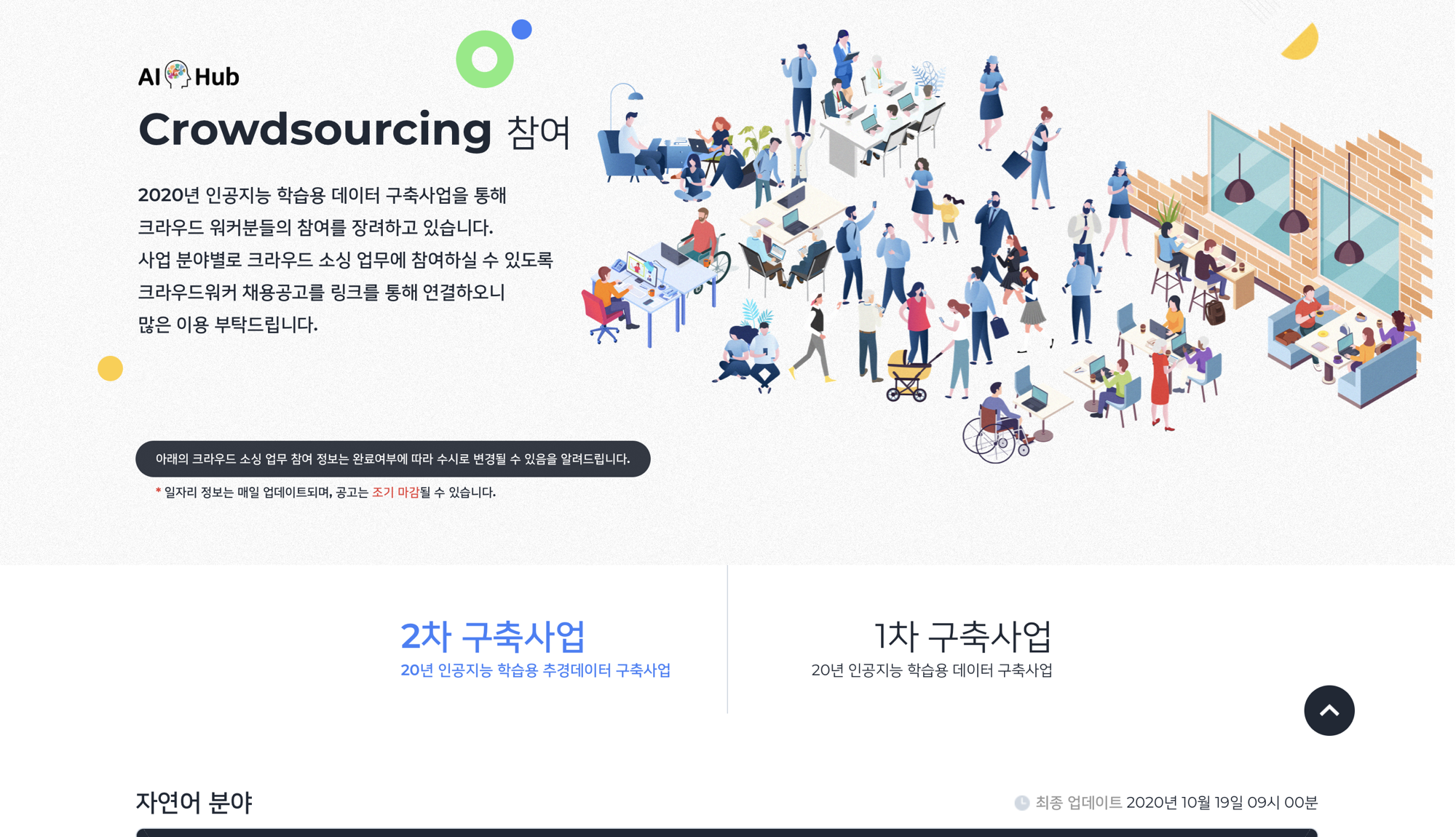 AI허브에서 크라우드소싱 참여 페이지로 들어가면 국고를 들여 진행하고 있는 크라우드 소싱 일거리를 한 눈에 확인 할 수 있습니다.