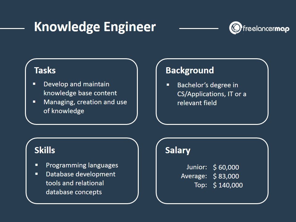 지식 엔지니어는 인공지능이 인간 수준의 의사 결정을 할 수 있도록 컴퓨터 시스템에 로직을 구축하는 일을 하는 직업이다. 대규모 데이터 기반을 설계 및 개발하고 AI 기능을 지원한다.