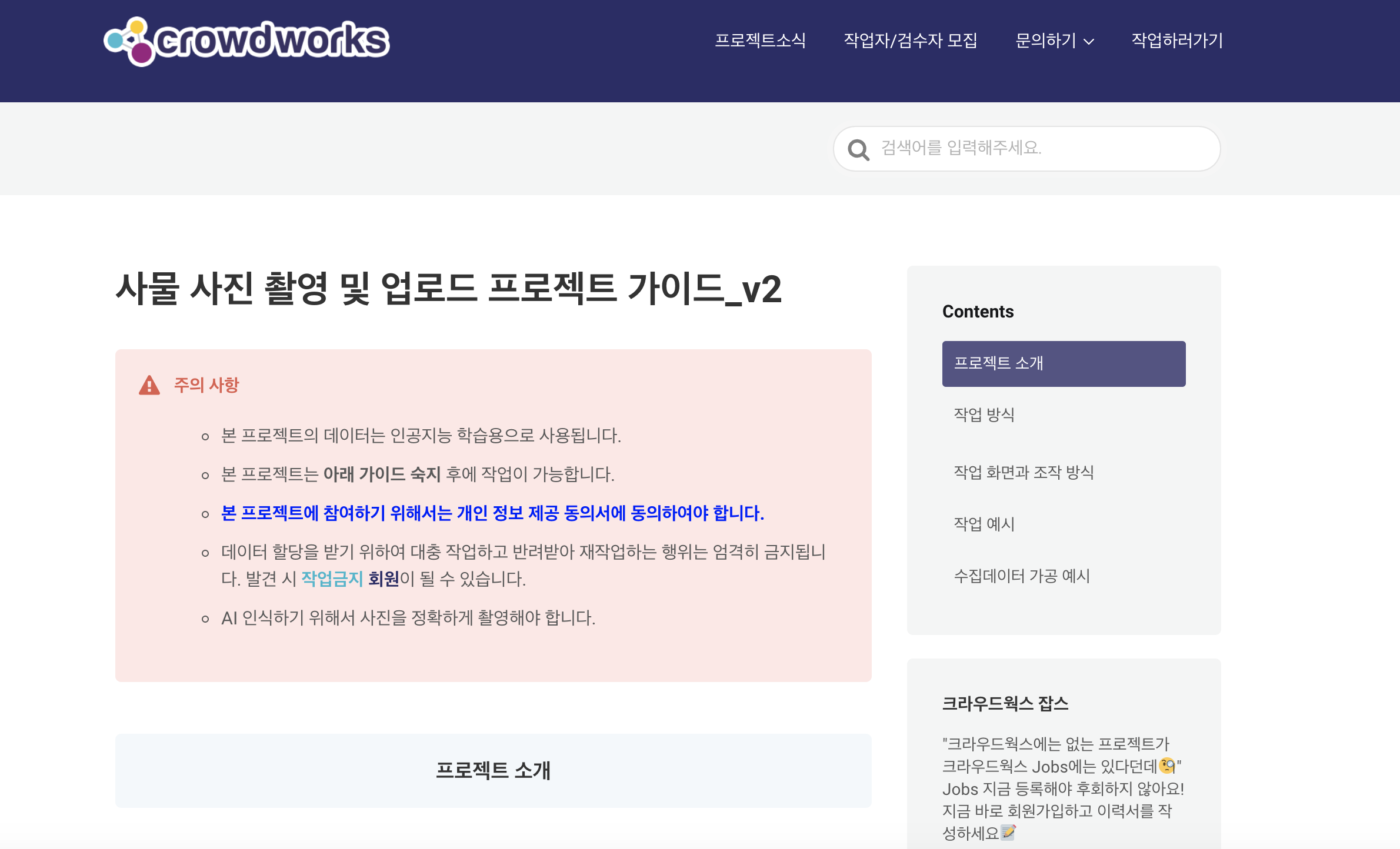 작업에 관한 상세한 가이드가 준비되어 있습니다. 예를 들어 사진 촬영이라면, 어떤 상황에서 어떠한 사진을 찍어야 작업물이 승인되는지에 대해 자세한 가이드라인을 제시합니다. 작업 참여자는 이에 의거해 작업을 진행하면 되는 구조입니다.