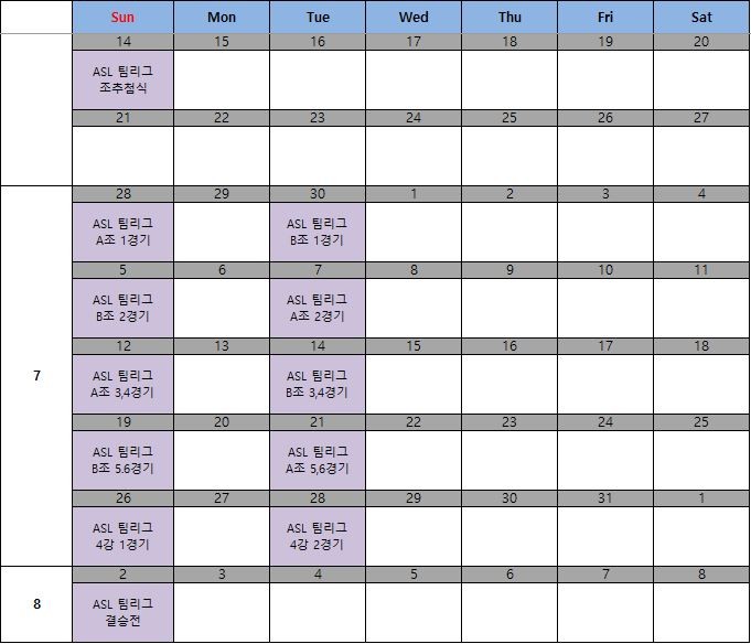 아프리카TV가 질레트 ASL 팀 리그 시즌1의 자세한 일정과 진행 방식을 ASL공식방송 공지를 통해 지난 12일 공개했다. 6월 14일 조추첨식을 시작으로 8월 2일 결승전까지 매주 일요일, 화요일에 경기가 펼쳐진다.