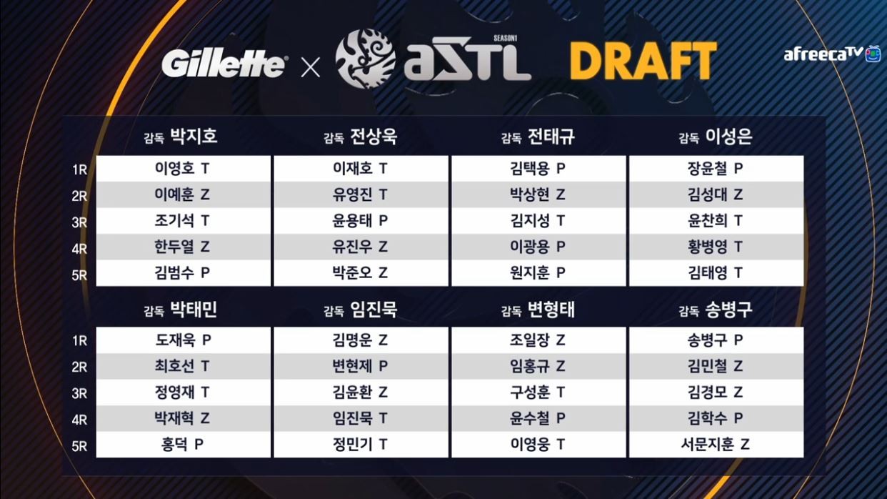 질레트 ASTL(아프리카 스타 팀 리그) 시즌1의 조추첨 및 드래프트 결과가 6월 14일 저녁 아프리카TV를 공개됐다.