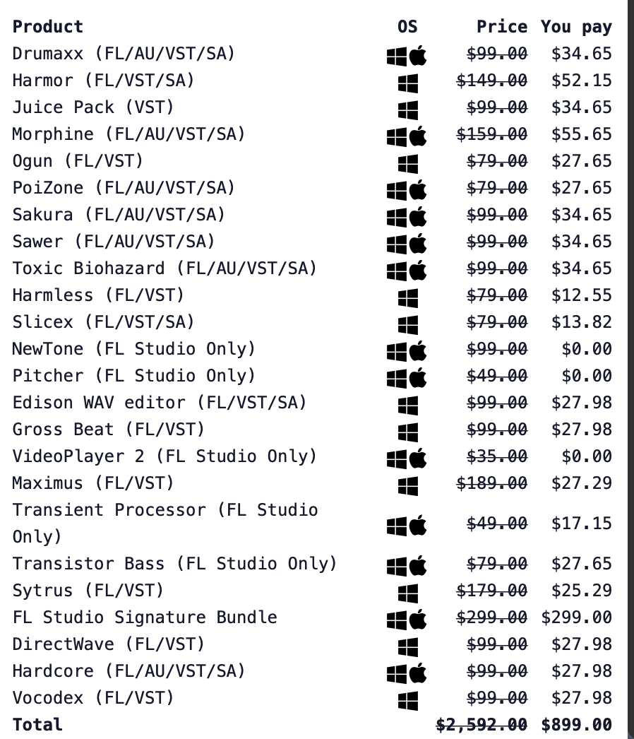 마지막으로 올 플러그인 번들(ALL Plugins Bundle)은 899불로 백만원이 훌쩍 넘는 가격을 자랑합니다. 겁나 비싼 이 옵션에는 FL 스튜디오의 모든 플러그인과 가상악기가 제공됩니다.