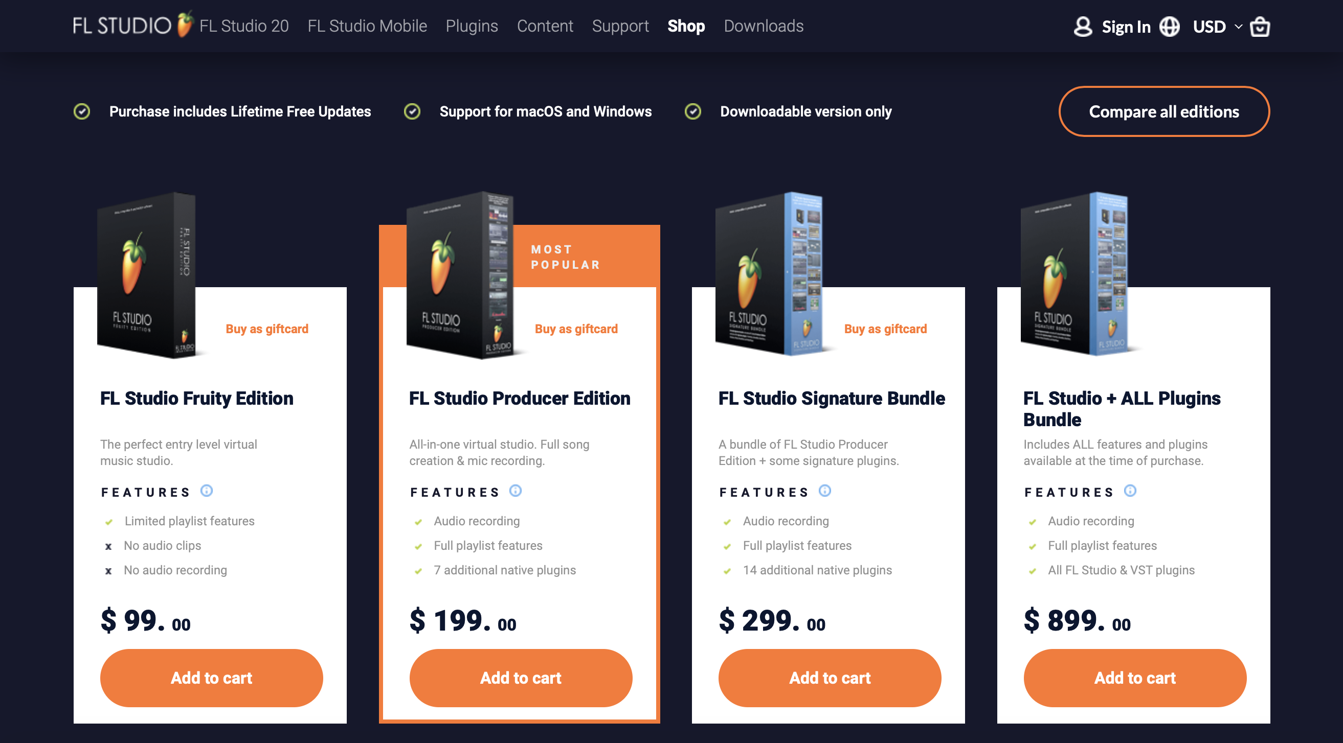 FL 스튜디오 구매에는 4가지 옵션이 있습니다. 가격대는 $99에서 $899로 다양하게 설정되어 있고, 9% 가량의 세금이 추가로 붙습니다.